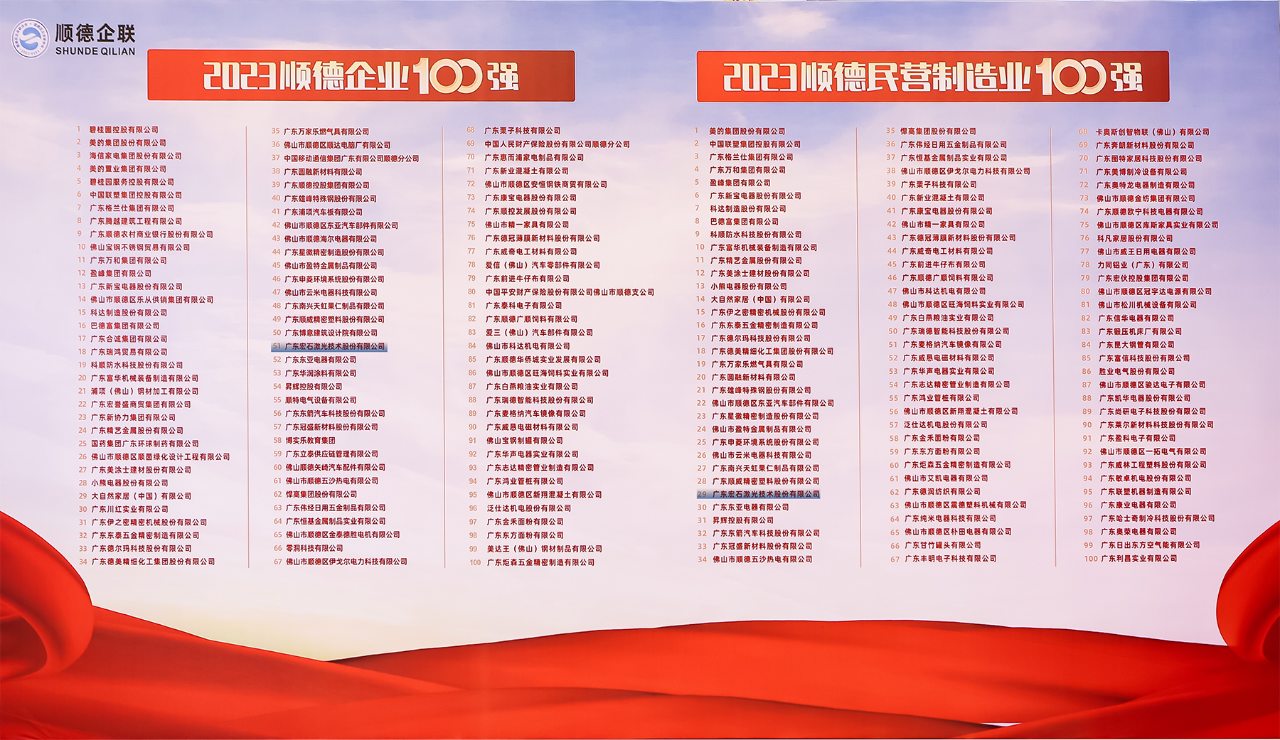 作為高新技術企業,宏山激光憑借過硬綜合實力,繼2021、2022年連續上榜后,再次榮登順德企業100強榜,位列第51位。榮登2023順德民營制造業100強榜,位列第29位。這不僅僅是宏山激光持續穩步發展的有力見證,更是對宏山激光追求高質量發展的一份肯定。